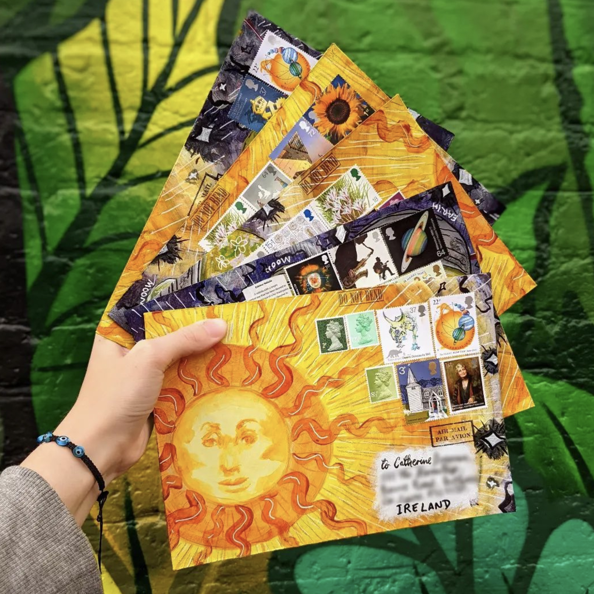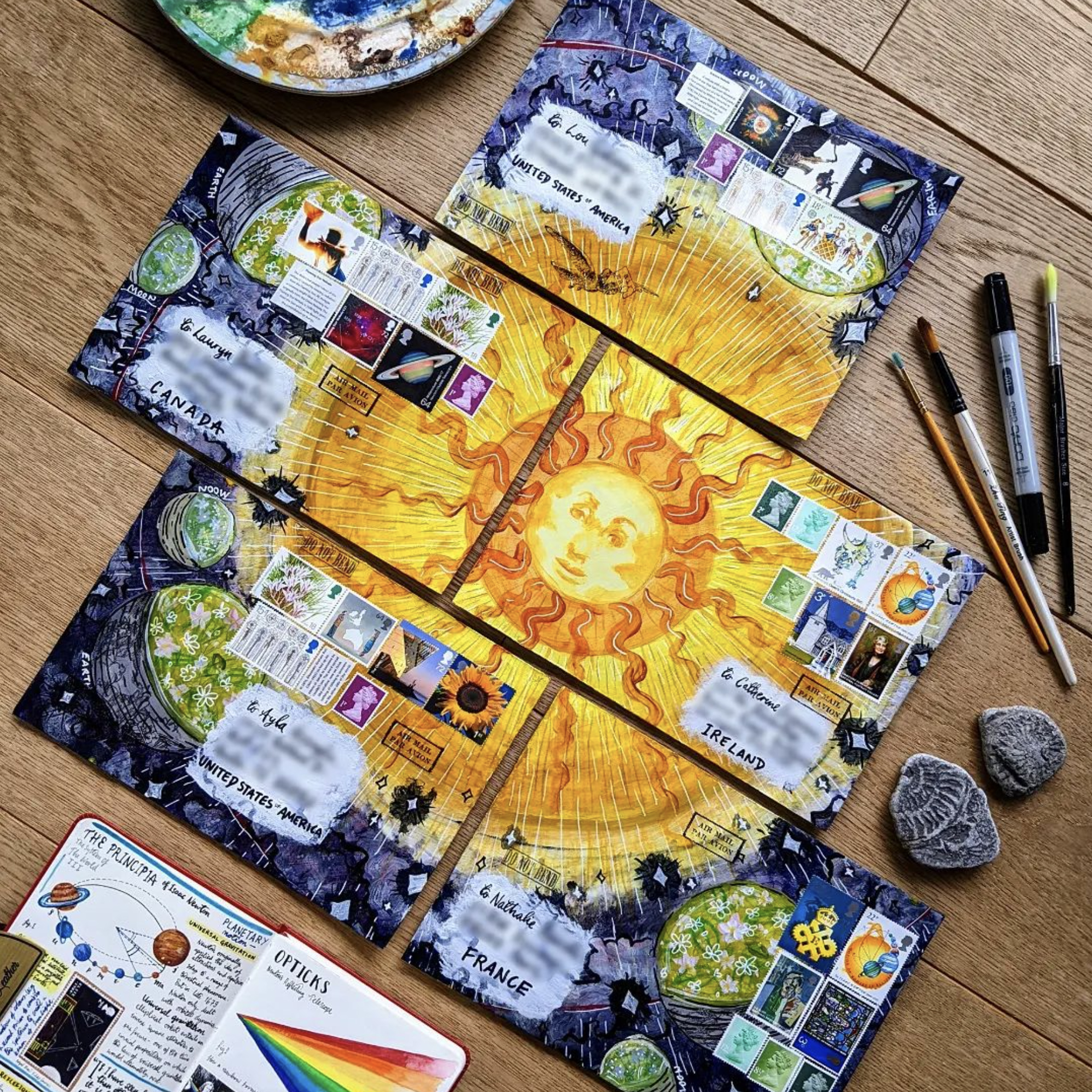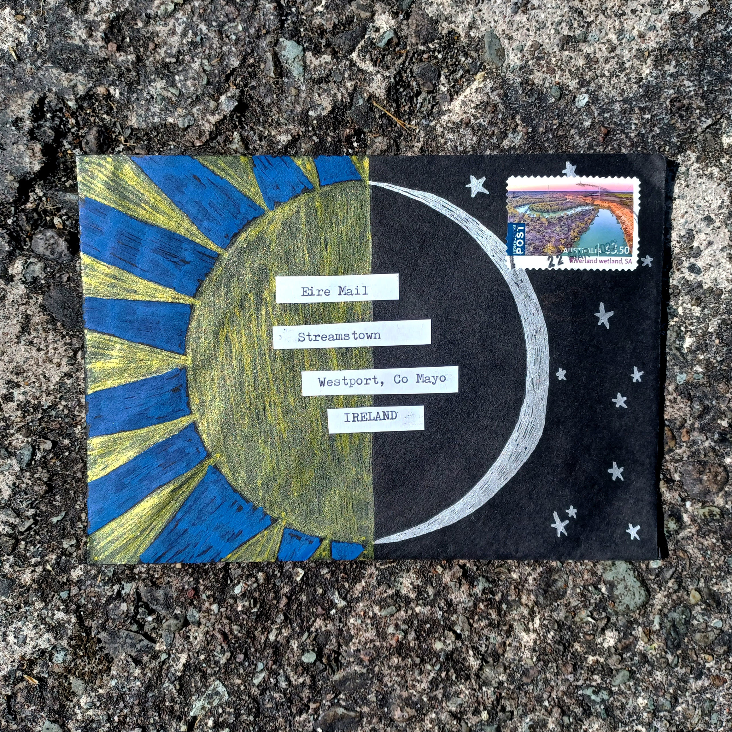 This Equinox envelope seems simple, but it’s very effective! Ally used acrylic markers (Posca pens, to be precise) to create this striking day and night scene on a black envelope. She typed, cut, and pasted the addresses on top of her work. I really love how uncomplicated, but powerful it is. Find Ally on Instagram, or stay at her holiday rental in Tasmania! (Hmm… perhaps we need an Elevated Envelope retreat?)