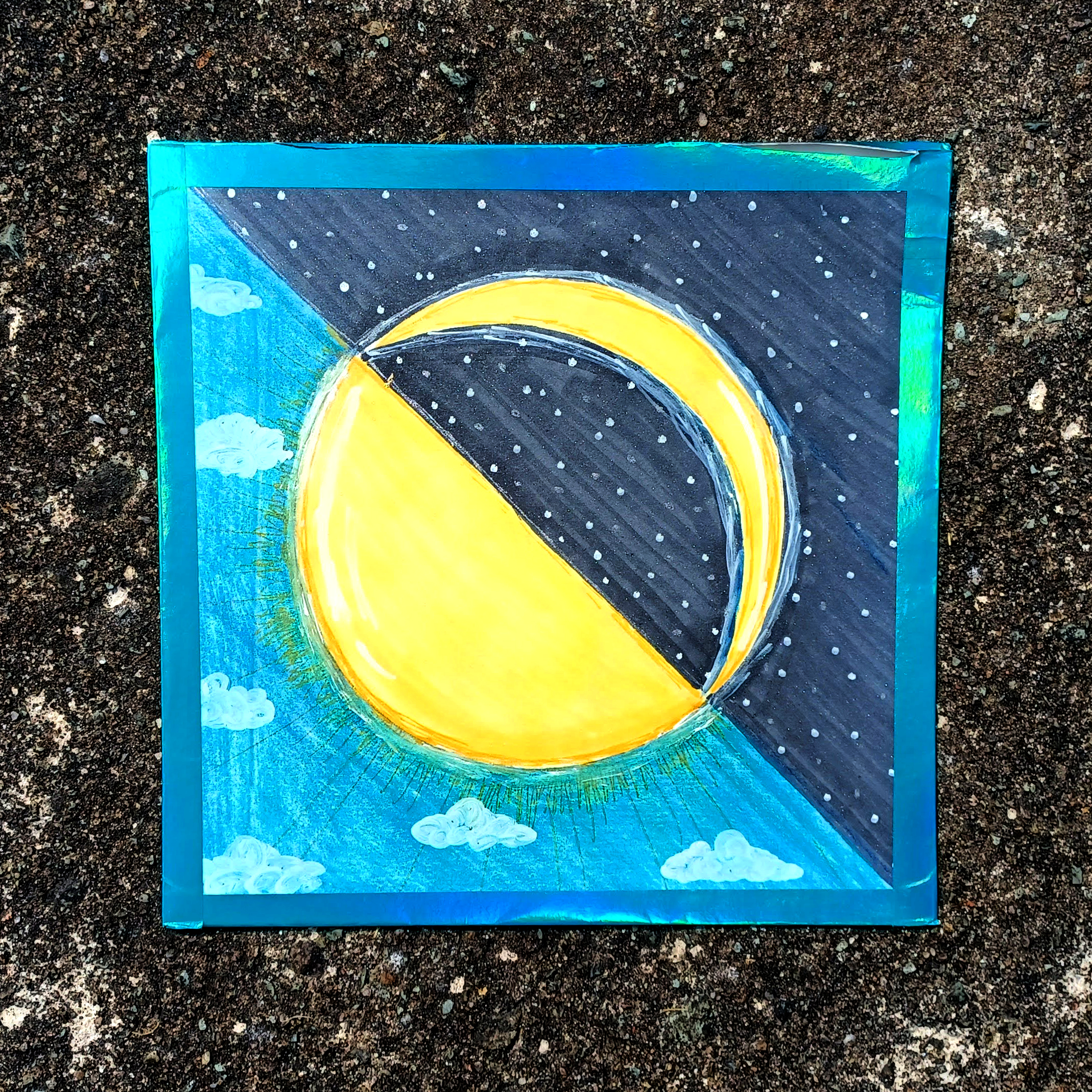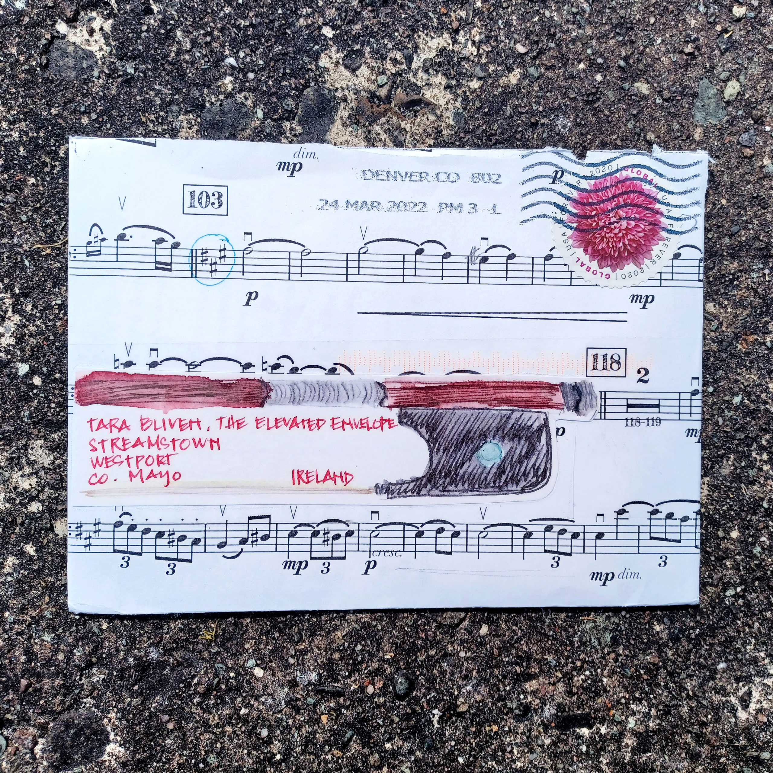 This is a very imaginative take on our theme. Jenny thought about “equinox” in terms of the many ways we all seek and need balance. She started studying cello as an adult, and has found it to be a rewarding part of a balanced life. Then, she took it all a step further to show how one literally balances the weight of the cello’s bow a certain distance from its edge. That’s what’s shown below: one third of the bow, hand drawn, and stuck onto an envelope she hand-made out of old sheet music. I think it’s so unique!