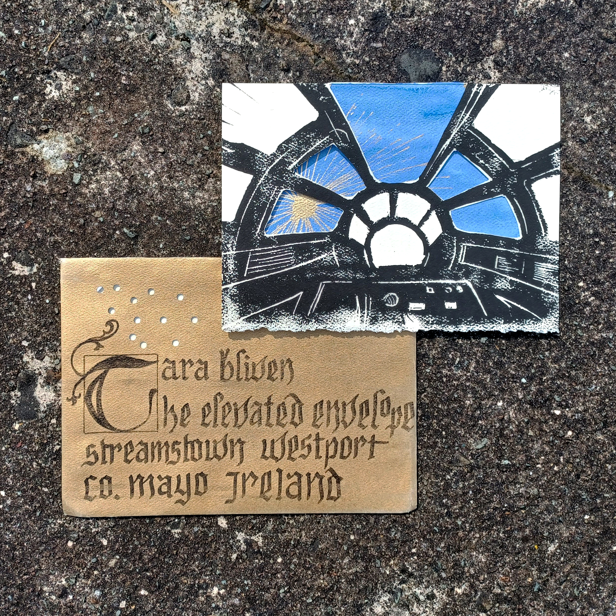 This is a wild one, so buckle up! Michelle is a scientist and artist who has confessed to enjoying “too much sci-fi.” (No such thing.) She was first inspired by the illuminated manuscript Les Très Riches Heures (pictured below). The envelope is painted in gold and hand-lettered, with tiny, punched-out “wormholes” for a peek at what’s inside. And you’d never guess what awaits you when you enter that dimension… A hand-printed and cut-out image of the view from the cockpit of the Millennium Falcon! What? That’s so cool! I really like how Michelle’s project takes you from the past (an ancient work of art) into a potential future (Star Wars).